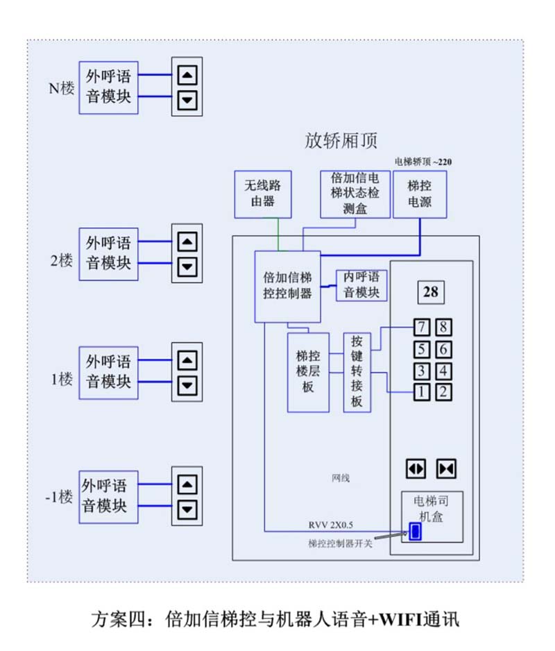 (1)機器人在電梯外,通個Wifi或4G網(wǎng)絡(luò)發(fā)送指令給倍加信梯控平臺,倍加信梯控云平臺收到指令后,將指令發(fā)給倍加信梯控系統(tǒng),倍加信梯控系統(tǒng)自動點亮上樓或下樓按鍵,實現(xiàn)呼梯功能。