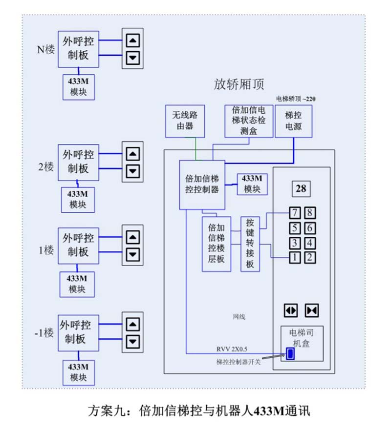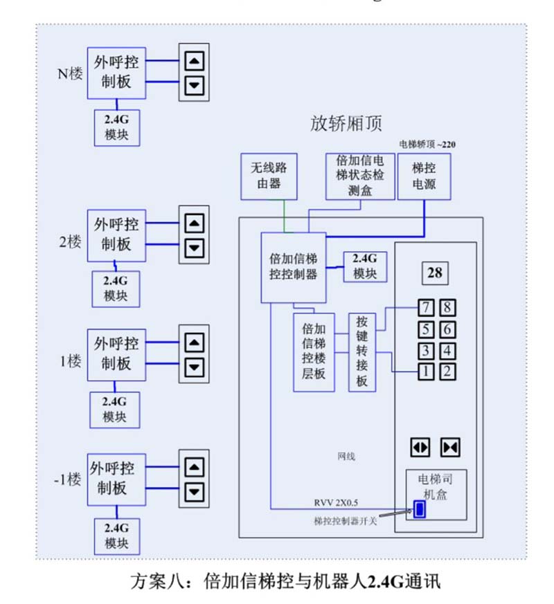 (1)機器人進入電梯后,通個Wifi或4G網(wǎng)絡(luò)發(fā)送指令給倍加信梯控云平臺,倍加信梯控云平臺收到指令后,將指令發(fā)給倍加信梯控系統(tǒng),倍加信梯控系統(tǒng)自動點亮對應(yīng)樓層按鍵,比如發(fā)去6樓指令,則6樓按鍵自動點亮,電梯送機器人員到6樓。