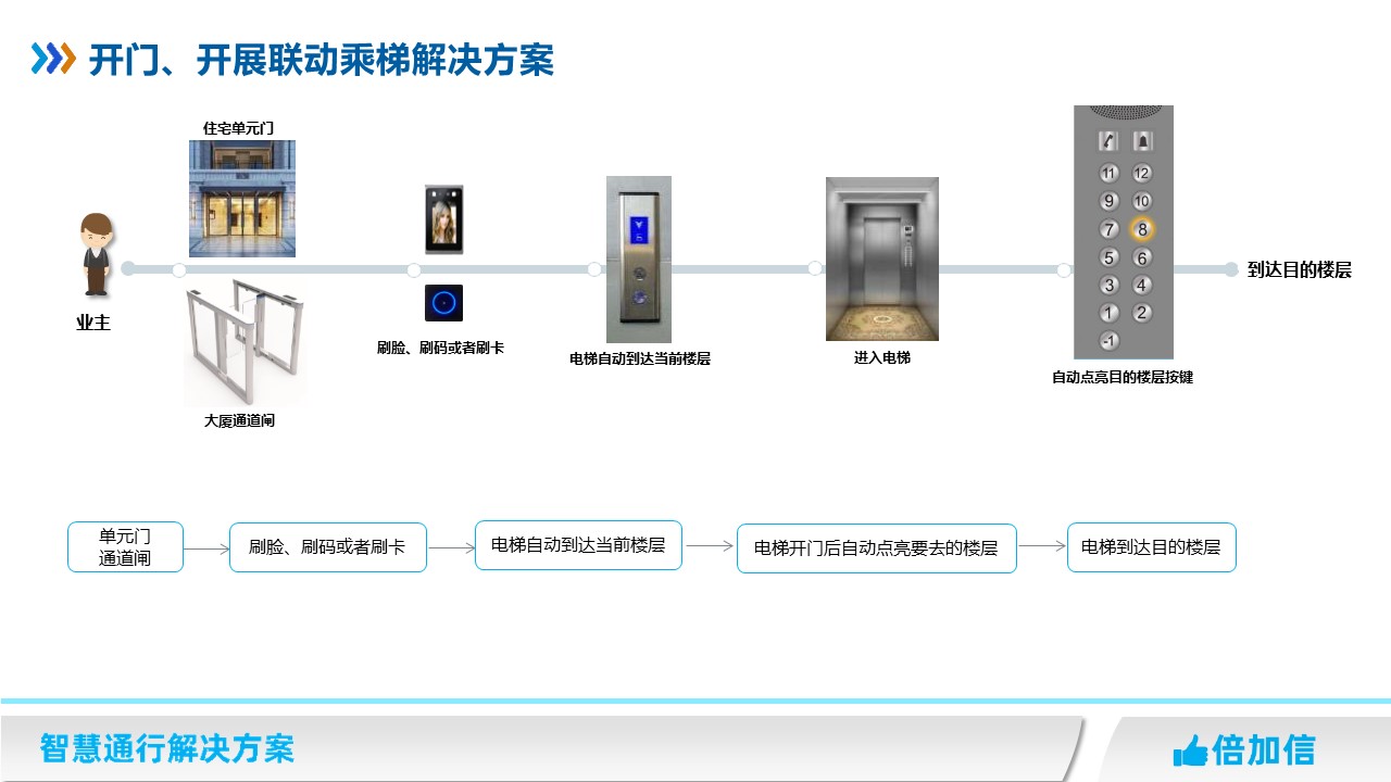1、單元門或者通道閘上面,刷卡、刷碼、刷臉后,自動呼叫電梯到當(dāng)前樓層;