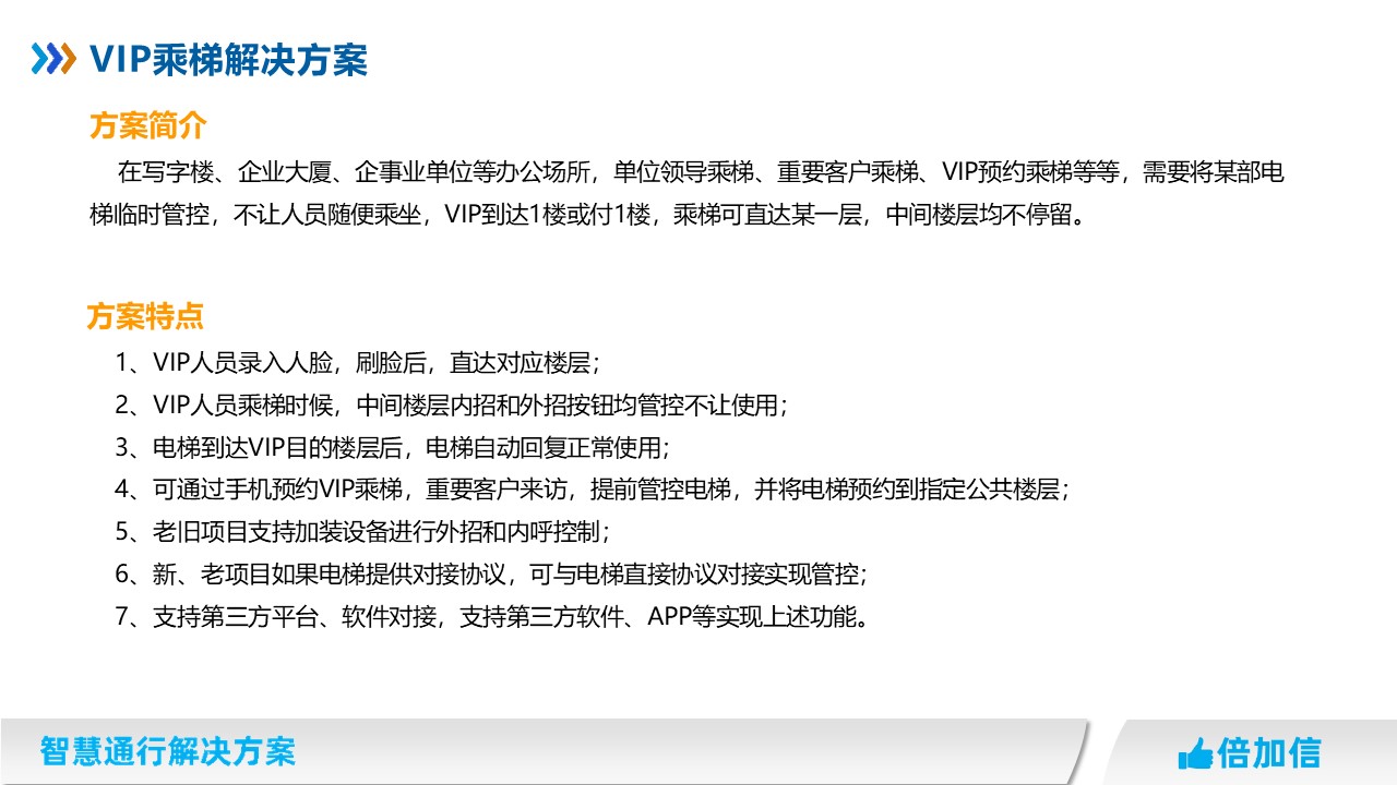 在寫(xiě)字樓、企業(yè)大廈、企事業(yè)單位等辦公場(chǎng)所,單位領(lǐng)導(dǎo)乘梯、重要客戶乘梯、VIP預(yù)約乘梯等等,需要將某部電梯臨時(shí)管控,不讓人員隨便乘坐,VIP到達(dá)1樓或付1樓,乘梯可直達(dá)某一層,中間樓層均不停留。