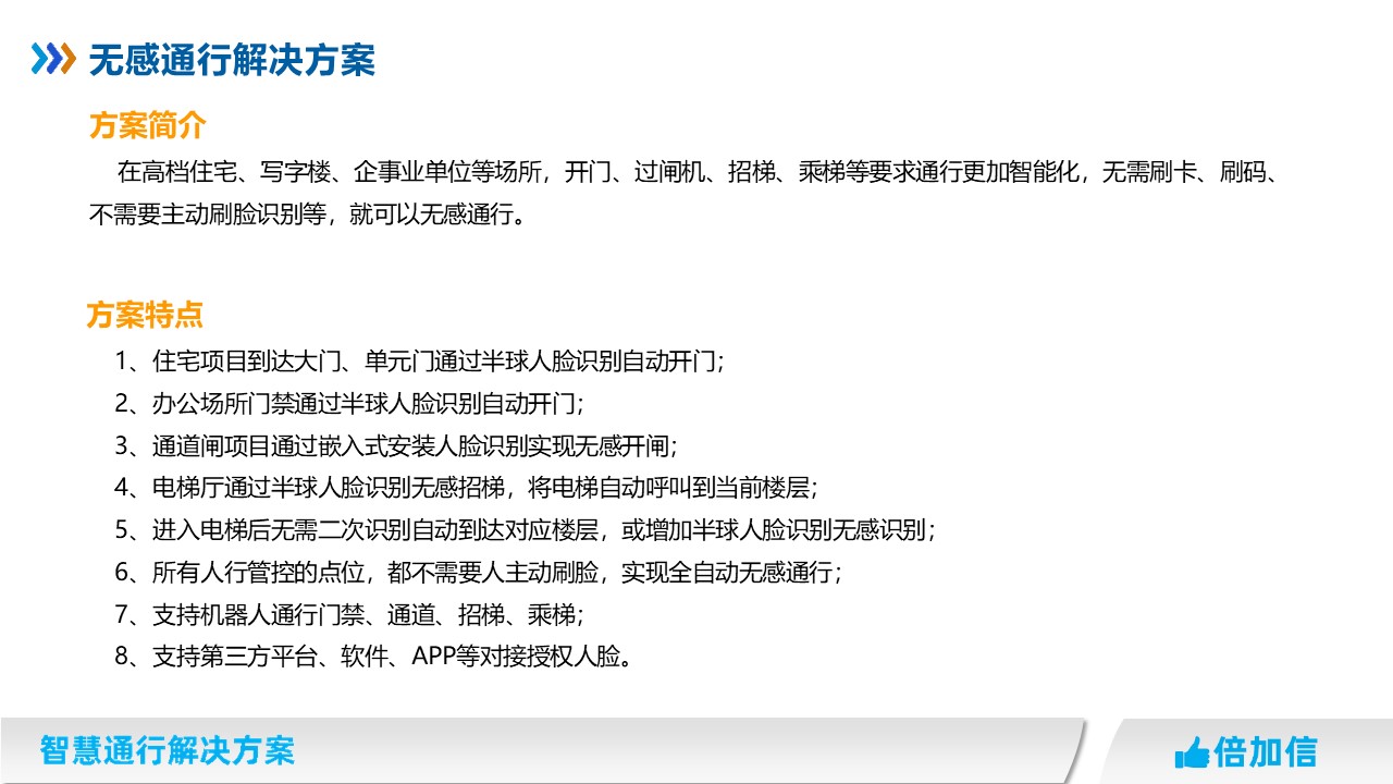 在高檔住宅、寫字樓、企事業(yè)單位等場所,開門、過閘機、招梯、乘梯等要求通行更加智能化,無需刷卡、刷碼、不需要主動刷臉識別等,就可以無感通行。